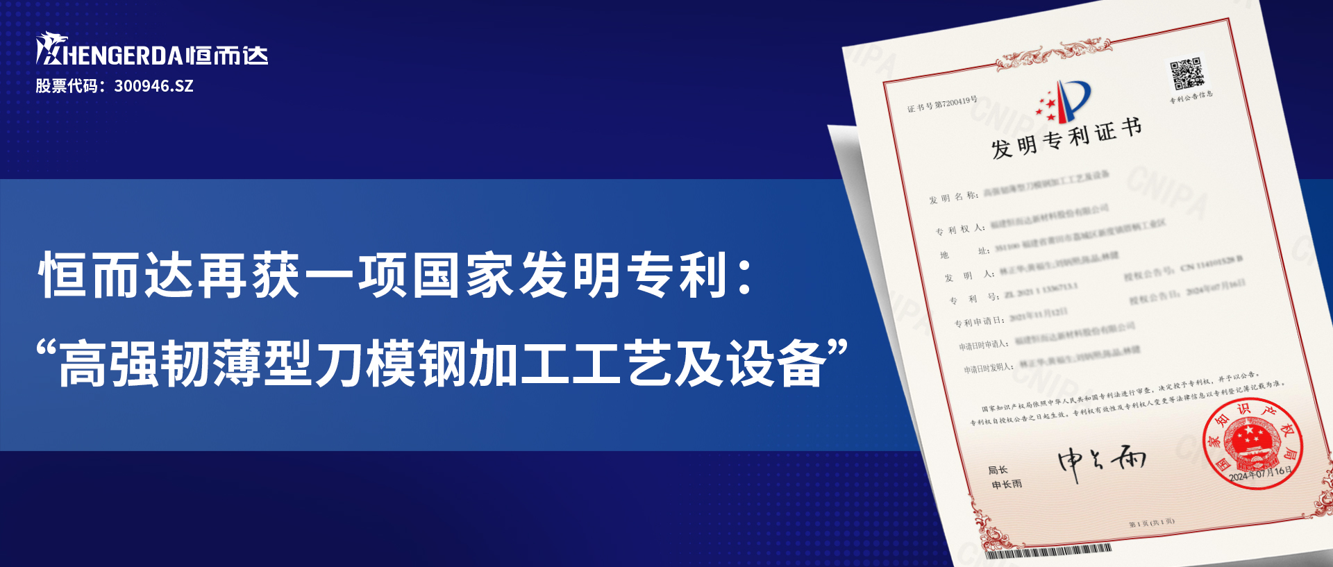 喜訊丨恒而達(dá)“高強(qiáng)韌薄型刀模鋼加工工藝及設(shè)備”榮獲一項(xiàng)國家發(fā)明專利!
