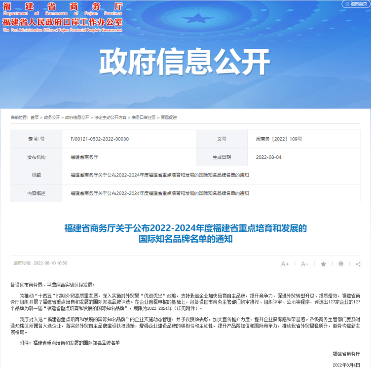 據(jù)悉,該項(xiàng)評(píng)定工作每三年開(kāi)展一次,旨在深入貫徹落實(shí)國(guó)家“十四五”時(shí)期對(duì)外貿(mào)易“優(yōu)進(jìn)優(yōu)出”戰(zhàn)略,培育和發(fā)展一批具有較強(qiáng)國(guó)際競(jìng)爭(zhēng)力的國(guó)際知名品牌,進(jìn)一步轉(zhuǎn)變外貿(mào)發(fā)展方式,推進(jìn)福建省由外貿(mào)大省向外貿(mào)強(qiáng)省轉(zhuǎn)變。根據(jù)《福建省商務(wù)廳關(guān)于開(kāi)展“福建省重點(diǎn)培育和發(fā)展的國(guó)際知名品牌”認(rèn)定工作的通知》要求,經(jīng)各設(shè)區(qū)市商務(wù)主管部門(mén)初審?fù)扑]、組織評(píng)審、公示等程序,127家企業(yè)127個(gè)品牌被認(rèn)定為新一屆“福建省重點(diǎn)培育和發(fā)展的國(guó)際知名品牌”。